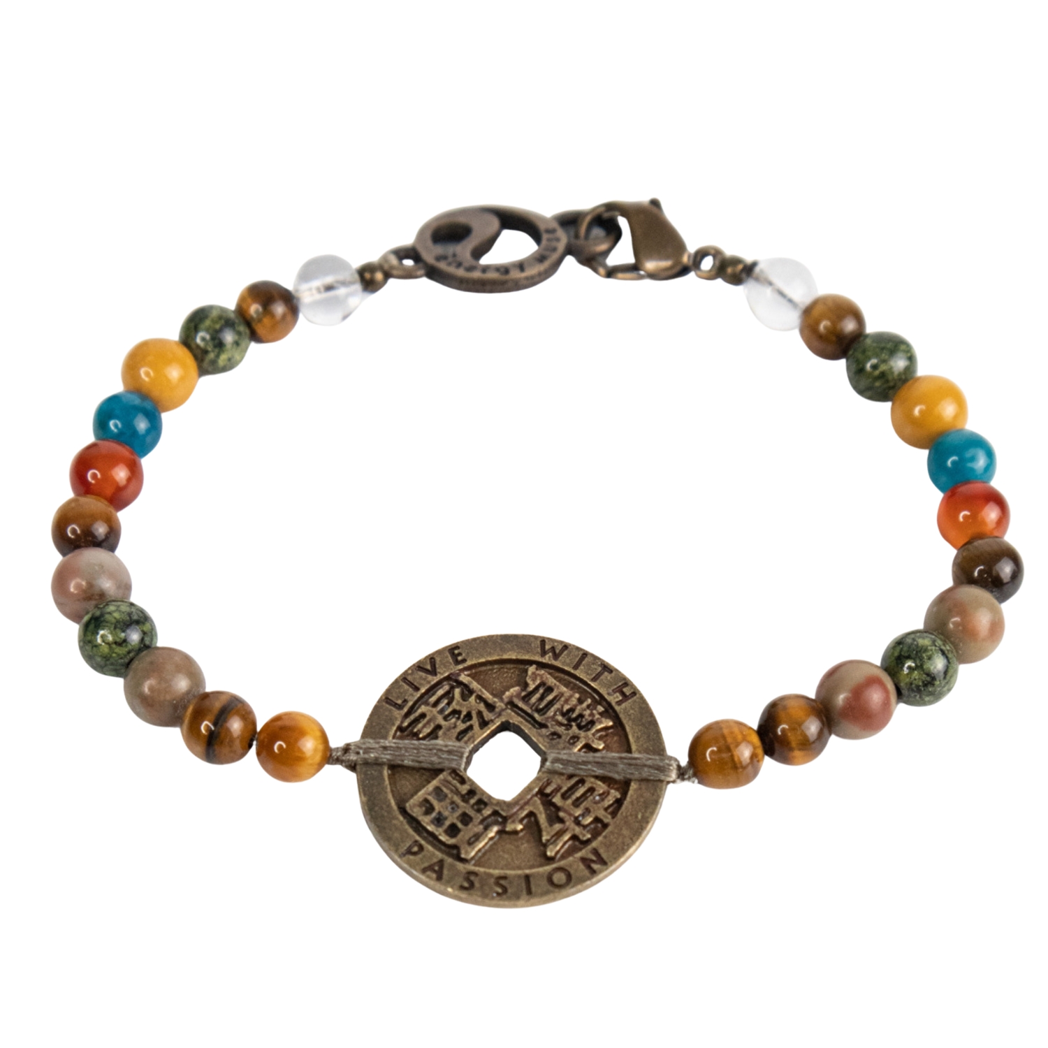 Our Limited Edition POWER bracelet represents: Strength, Courage and Amplified Energy. Leopard Skin Jasper grounds your energy and connects you with the energy of Earth. Yellow Tiger’s Eye brings personal power, movement and good luck. Yellow Jasper provides you with the courage to go after your dreams. Carnelian gives you strength, confidence and helps you believe in yourself. Serpentine helps you through your transformation. This healing stone is filled with wisdom and intuition to guide you toward your highest purpose. Blue Apatite improves your health and well-being by reinvigorating your appetite for life, so you can bring your mind-body-spirit status to life. The Chinese Coin is an ancient and powerful manifesting tool, valued for attracting wealth, luck and endless opportunity that includes Tony’s iconic message, “Live with Passion.”